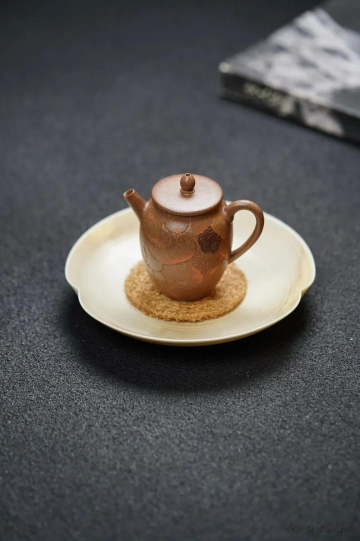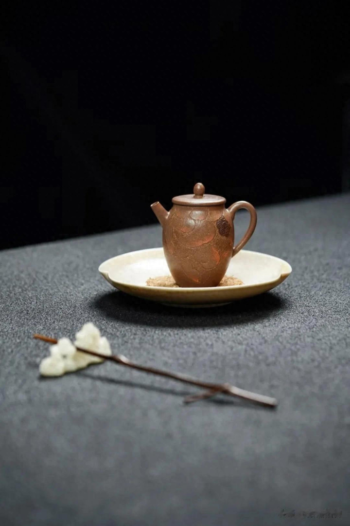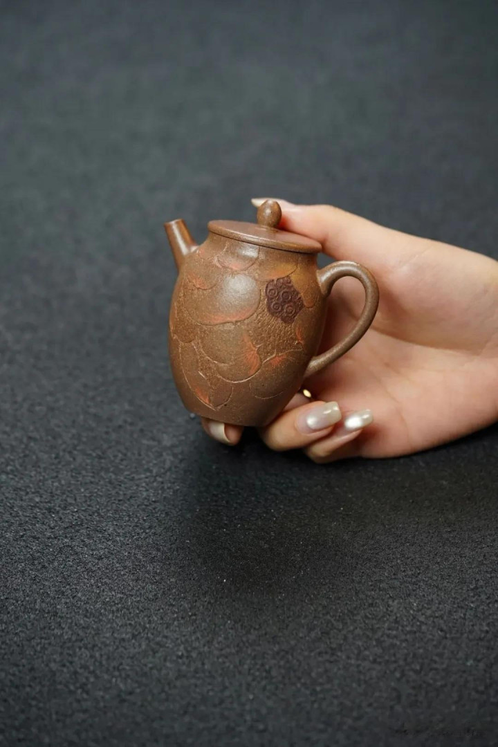 这便是紫砂美学里的第一重境——材质与肌理之美。青降坡泥,原矿之色,不参杂任何现代金属氧化物作为着色剂。它的颜色,是矿石的本真,也是窑火与泥土的一场漫长对话后,最终达成的默契。这抹色泽,初看或许不及朱泥娇艳,不如紫泥沉郁,但它耐看,像一位洗尽铅华的文人,气韵是往内收的。随着日复一日茶汤的滋养、手掌的摩挲,它的光泽会愈发深邃柔和,生出温雅的“包浆”,记录下光阴与人的痕迹。那手工琢刻的莲花,其“韵味十足的老味”,正来自于这种不追求绝对规整的“手工感”。每一刀都带着匠人呼吸的节奏与手腕的力度,留下独一无二的、有温度的笔触,让冰冷的泥土,有了植物的生气与古雅的文心。