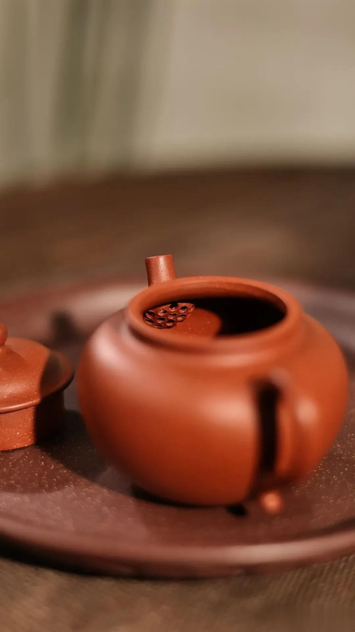 于是,日常被它点化了。烦冗时,看着壶身那温润的朱红——是原矿的砂粒在光下泛着星星点点的金砂,是无数细微颗粒拥抱成的醇厚色泽——心便跟着沉静下来。注水,那精心设计的“内推孔”让出水如断珠,爽利无比。这流畅,何尝不是一种生活该有的节奏?不拖沓,不纠缠,清清爽爽。一注热水,它妥帖承接;一道茶汤,它毫无保留地倾尽所有。