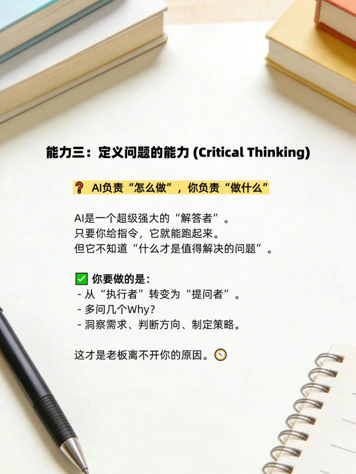 Critical Thinking(判断力):AI可以给出100个答案,但只有你能决定哪一个是正确的方向。