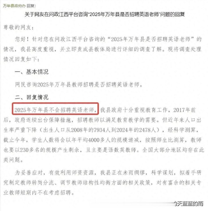 江西两个县最近宣布“明年不再招聘高中英语教师”、“暂停教师招聘”,四川一个县城的教师选调甚至出现了岗位无人报名的尴尬情况。