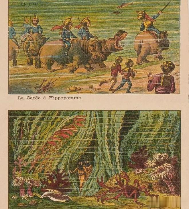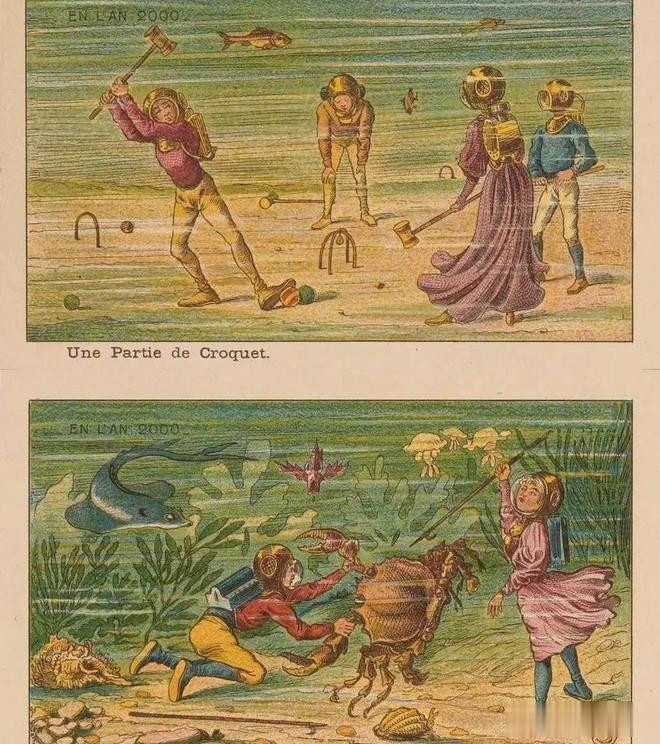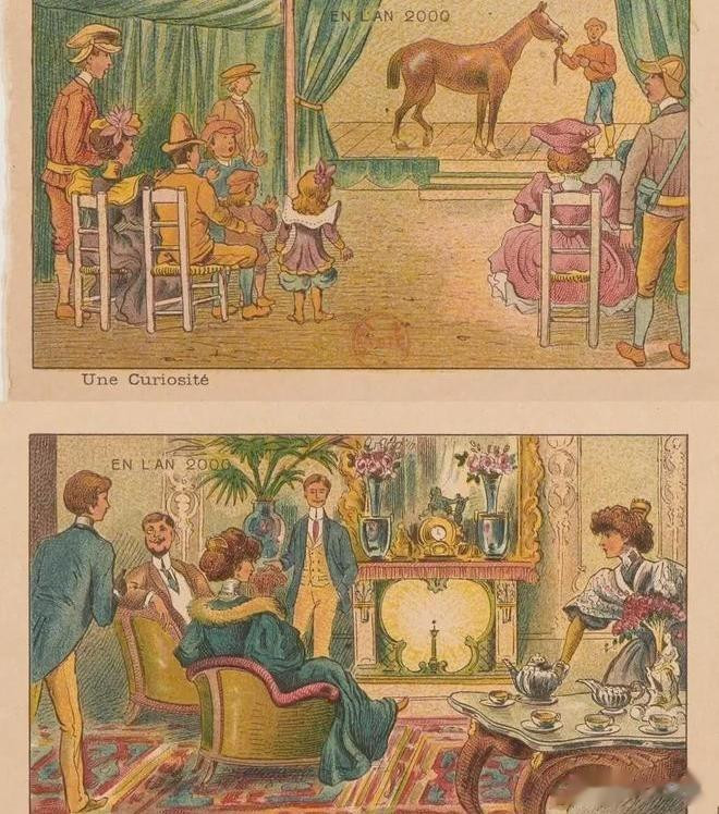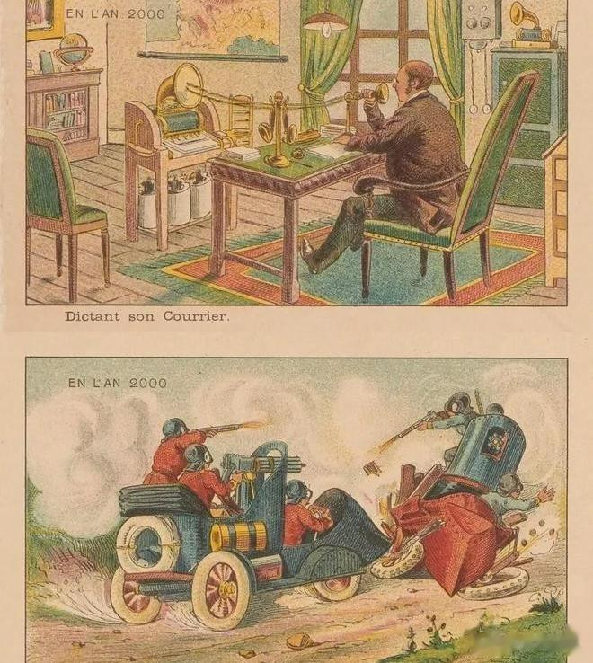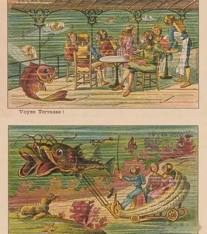 19世纪末的欧洲,正值工业革命高峰,人们对技术的信心几乎膨胀到了极限。巴黎就曾举办过万国博览会,展出各类新奇发明,媒体热衷于预测下一个世纪的生活图景。法国插画家Jean-Marc Côté给出的2000年想象,就是一系列充满蒸汽朋克色彩的生活场景。那个年代的受众主要是渴望改变的城市中产,他们既害怕也憧憬未来,期待有一天能用机器解决所有难题。