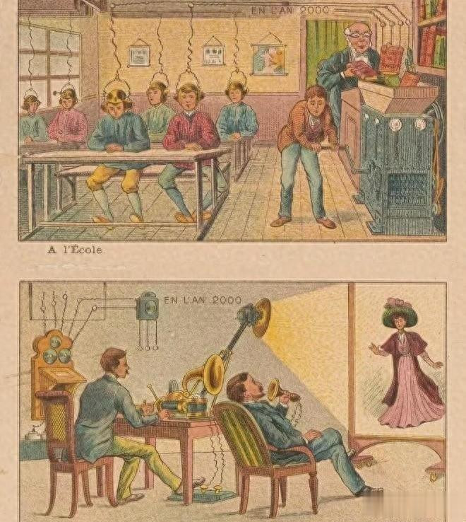 这些幻想为何如此大胆?技术的快速进步让人们误以为未来只是时间问题。蒸汽机、电力、电话接连问世,仿佛每十年就能见证一次社会巨变。于是,绘画里出现了警察骑着机械鸟巡逻、学校用自动化机器教学、甚至医生远程操控机器人为病人开刀。这种预测更像是将当时的新鲜玩意儿无限放大,假设只要技术继续发展,什么都能实现。