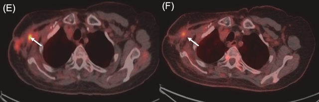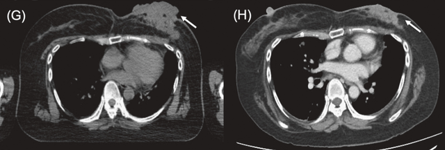 一名76岁女性,患有三阴性浸润性导管癌。其后出现胸壁和腋窝复发,侵犯臂丛神经并导致右臂完全瘫痪。BNCT治疗后右肩部和皮下病灶消退,仅残留小腋窝结节,2025年11月的随访胸部CT显示,患者照射部位保持部分缓解,局部控制得到改善。