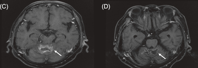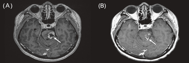 一名68岁女性,患有三阴性浸润性小叶及导管乳腺癌(左乳),出现小脑转移。她此前接受过全身化疗和立体定向放射治疗(SBRT),但出现颅内进展。BNCT治疗后MRI显示肿瘤显著消退,患者疼痛和肢体无力症状改善,未出现明显毒性反应。