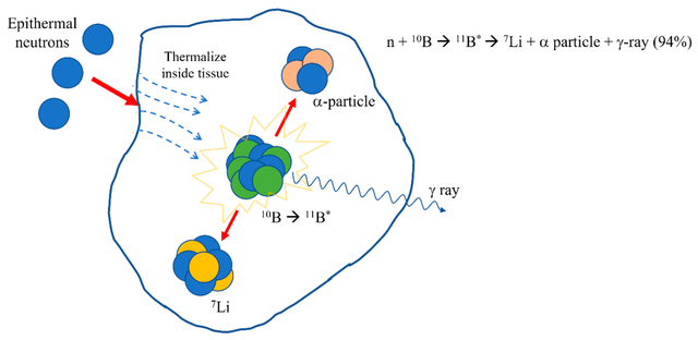 该疗法通过将含硼化合物选择性富集于肿瘤细胞中,再利用中子束照射肿瘤部位,从而实现对癌细胞的精准杀伤。该疗法基于稳定同位素硼-10在低能热中子照射下发生的核反应,产生高线性能量转移的α粒子(氦-4核)和反冲锂-7核,这些粒子在约单个细胞直径(