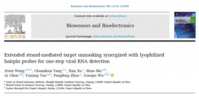 近日,东南大学附属中大医院医学检验科主任吴国球教授团队,在国际生物传感领域权威期刊《BiosensorsBioelectronics》(中科院一区Top期刊)发表了题为“Extendedstrand-mediatedtargetunmaskingsynergizedwithlyophilizedhairpinprobesforone-stepviralRNAdetection”(延伸链介导的靶标解蔽协同冻干发夹探针用于一步法病毒RNA检测)的创新性研究成果。该研究为病毒感染的即时检测(POCT)提供了全新的解决方案。
