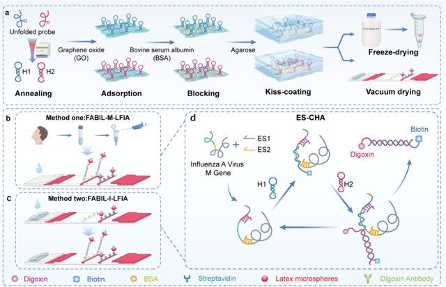 方案:(a)冻干预封装技术的操作流程;(b)FABIL-微球-侧向流检测流程(FABIL-M-LFIA);(c)FABIL-集成式--侧向流检测流程(FABIL-I-LFIA);(d)延伸链介导的催化发夹探针识别并催化流感A病毒保守序列的过程。