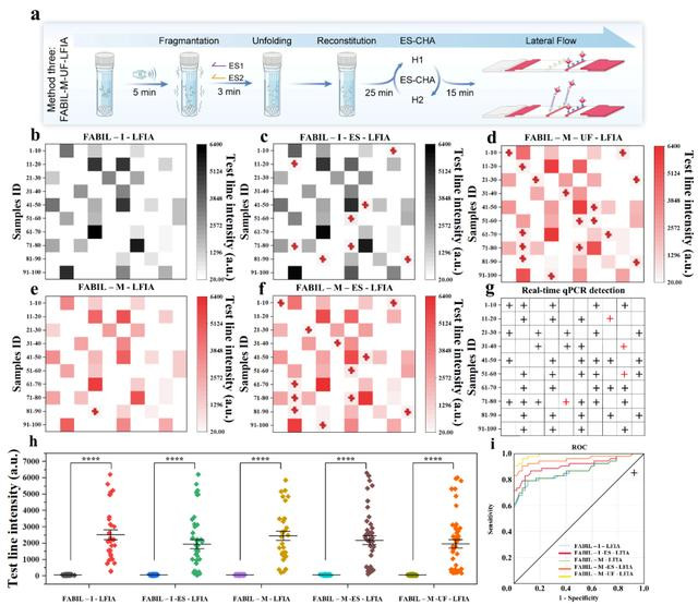 图:FABIL-LFIA的临床性能评估。(a)FABIL-M-UF-LFIA的操作流程示意图;(b)FABIL-I-LFIA;(c)FABIL-I-ES-LFIA;(d)FABIL-M-UF-LFIA;(e)FABIL-M-LFIA以及(f)FABIL-M-ES-LFIA临床检测能力的评估;(g)PCR法检测样本库的结果;(h)FABIL-LFIA信号强度的统计图;(i)FABIL-LFIA的ROC曲线。