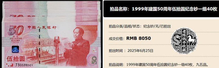 就在今年6月份举行的北京保利2025春拍钱币专场拍卖会上,40张连号的50元建国钞,一口气拍出了8050元,折算下来,单张差不多201元!