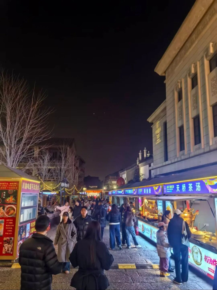 美食荟的魅力不仅在于风味多样。街区为摊位统一接通水电,配备油烟净化设备,让商户实现“拎包入住”;百余套露营帐篷、外摆桌椅搭配夜间亮化装置,星星点点的串灯与巍峨城门相映成景,户外暖气更驱散了冬日寒意,让游客愿意放慢脚步,在街巷间细细探寻。