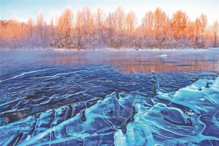 大兴安岭南麓封冻的多布库尔河寒雾氤氲缱绻,两岸树林枝头挂上薄薄的白霜,河湾冰面上结出千姿百态的冰花,这里仿佛凝固在了童话世界里。蓝调时刻,静谧深邃,宁静安祥;黄金时刻,紫气升腾,迷离梦幻。“冻”出的美,珍贵稀有,气温略高,树枝上的白霜以及“冒白烟”的寒雾便无影无踪了。