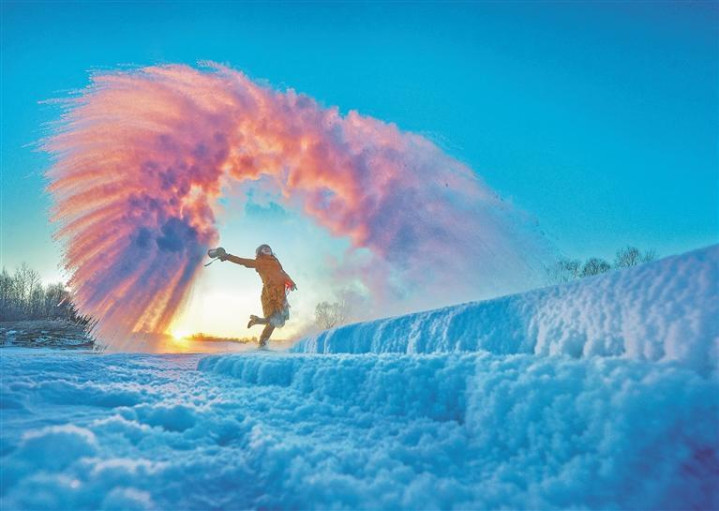 游客在多布库尔河畔雪地上玩泼水成冰。