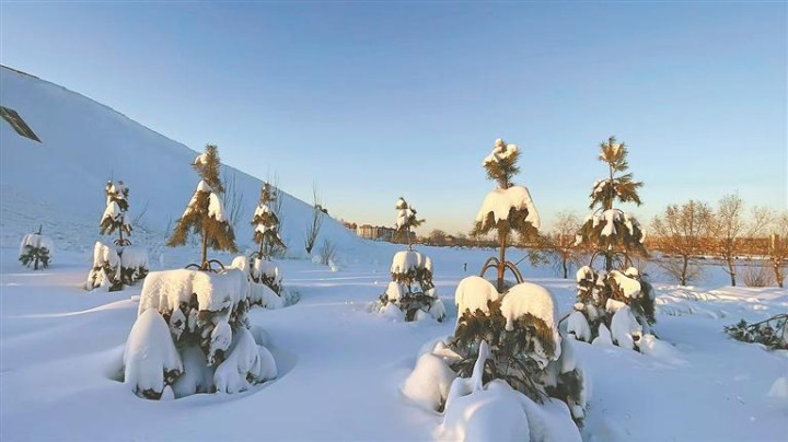 沿着湖岸缓步前行,最先映入眼帘的是那些被雪装扮的树木。岸边的白杨、垂柳、松柏,都褪去了枝叶的葱茏,换上了洁白的盛装。垂柳的枝条被积雪压弯了腰,毛茸茸的雪团挂在枝头,像是一串串白玉雕琢的流苏,微风拂过,雪粒簌簌落下,在空中划出细碎的银弧。松柏则依旧挺拔,墨绿的枝叶间积满了白雪,宛如一个个身披银甲的卫士,守护着这片冰雪天地。最动人的莫过于树挂,一夜寒风过后,树枝上凝结着一层薄薄的冰晶,阳光照射下,晶莹剔透,闪烁着钻石般的光芒。偶尔有飞鸟掠过枝头,抖落满身的碎雪,惊起一阵雪雾,而后便消失在远方的白茫茫之中,只留下几声清脆的鸣叫,在空旷的湖面上回荡。