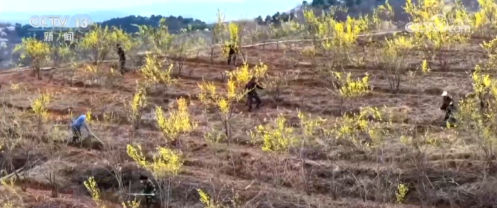 在山西省安泽县青松岭,这里的连翘插足盛花期。从空中俯视,连片的金色花海与蓝天白云、青山绿树奇妙无比,蔚为壮不雅。春日暖阳下,农户们合手紧春管重要期进行剪枝幽谷。