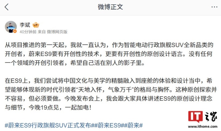 IT之家4月9日音讯,蔚来创举东说念主、董事长、CEO李斌本日发文谈及了原创缱绻。他以为,算作智能电动行政旗舰SUV全新品类的始创者,蔚来ES9要有始创性的时间。