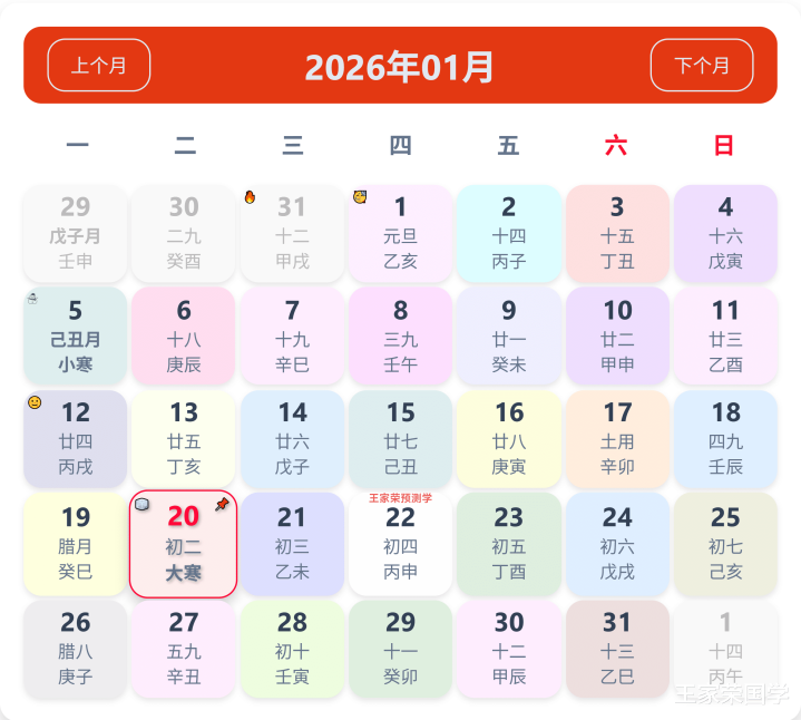 公历日期:2026年1月20日 星期二 ♒水瓶座农历日期:二〇二五年腊月初二 ♂火曜日干支纪年:乙巳年 🌷木蛇🐍 纳音:覆灯火干支纪月:己丑月 🏠土牛🐮 纳音:霹雳火干支纪日:甲午日 🌲木马🐴 纳音:沙中金纪念节日:大寒