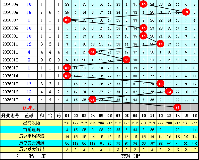 蓝球分析(定义:01-04为一区,05-08为二区,09-12为三区,13-16为四区):上期蓝球开出一区号码04,最近10期蓝球四区落号比为4:1:4:1,总体上二、四区蓝球较少,一、三区蓝球表现较热,本期蓝球看好在第四区开出,独蓝参考14。