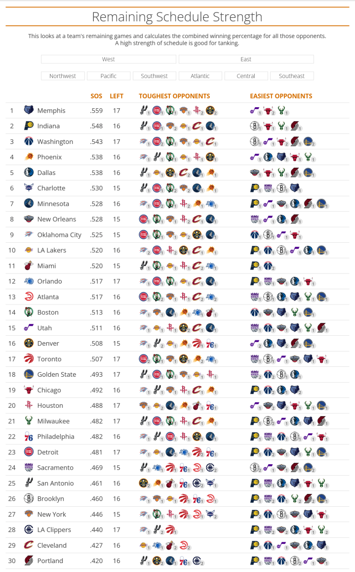 快船(第 28)、尼克斯(第 27)通常位列倒数,这让他们在冲刺季后赛时领有一定上风。而火箭以 0.488 的 SOS 排在第 20 位,剩余17场比赛的难度处于定约中游,这为他们冲击季后赛附加赛提供了均衡的赛程要求。