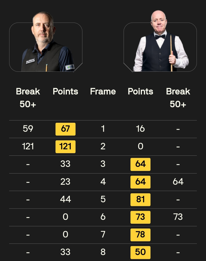 全场比赛,希金斯不仅打出了那波奠定胜局的七连鞭,更在比赛终末关头交代了敌手从2-7到8-8的放浪反扑,其情绪修养之弘大,控场智力之老辣,令东谈主叹服。而关于马克·威廉姆斯而言,从2-0高出到2-7过期,再到将比分扳成8-8平,这场过山车般的比赛最终以失利告终,无疑是一次千里重的打击,这位大满贯选手不得不接受惨遭一轮游的苦涩结局。