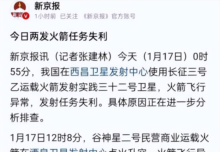 航天这块儿,发射出问题其实挺常见的,毕竟技术门槛高,风险大。可是一天之内连续两次失利,这事儿在咱们国家历史上还真不多见。就在二零二六年一月十七日,先是凌晨时分西昌卫星发射中心那边,长征三号乙运载火箭带着实践三十二号卫星上天,结果三级飞行段出了异常,导致整个任务没成功。接着中午十二点多,酒泉卫星发射中心又发射了谷神星二号商业运载火箭,这是它的头一次上天尝试,也因为飞行过程中出现问题,没能完成预定目标。现在两边都在查具体毛病出在哪儿,官方消息就是这样,还没给出最终结论。