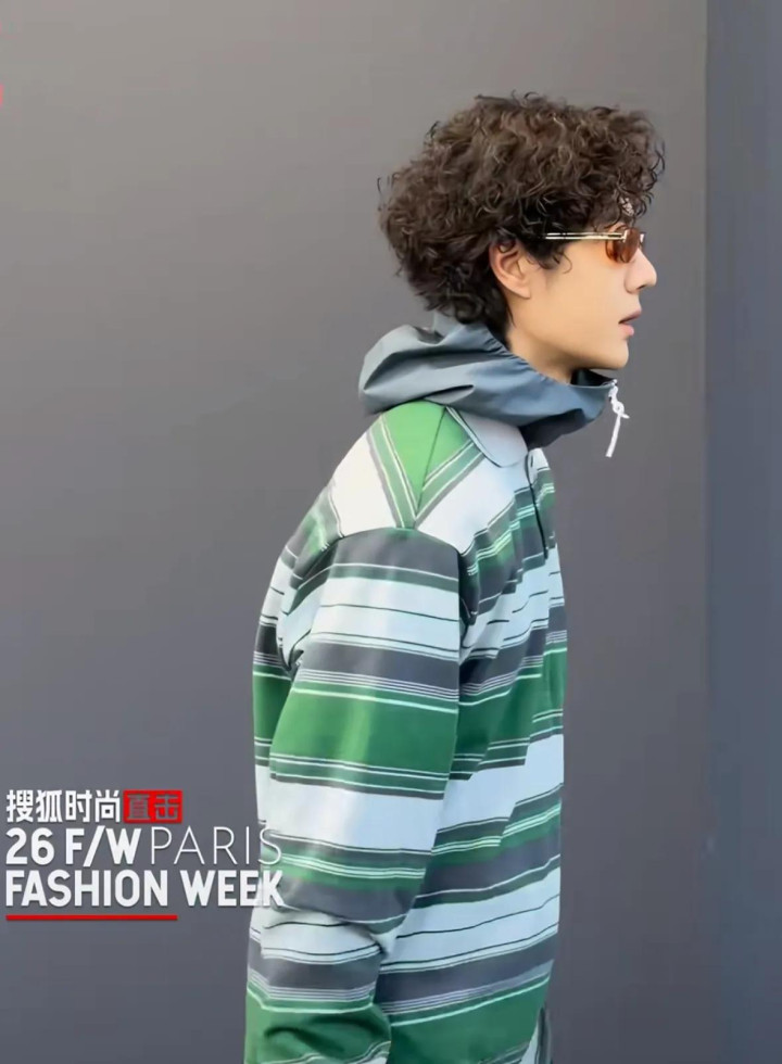 王一博身穿绿色条纹上衣,戴着茶色的墨镜,一头小鬈发,双手插兜拍照果真好酷,不得不说他此次的造型果真夯爆了。