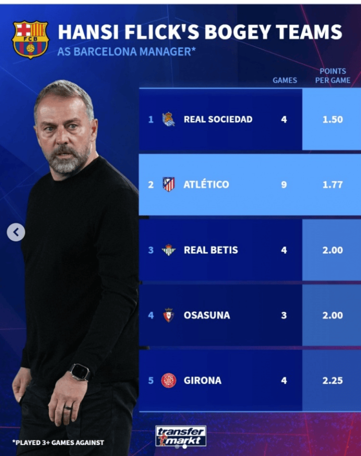 此外,弗里克合手教巴萨对阵马竞场均只得回了1.77分,这项数据只比对阵皇家社会(1.5分)时多: