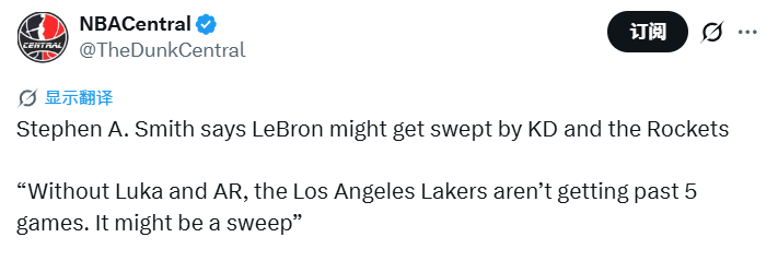 北京时刻4月13日,花名“好意思国杨毅”的闻明球评斯蒂芬-A-史小姐在节目上发表了对火箭vs湖东谈主这轮系列赛的见解。他认为湖东谈主很可能会被横扫,最多撑5场,但詹姆斯深信能输出漂亮的数据。以下是他的言论——