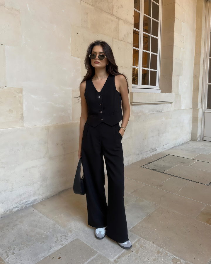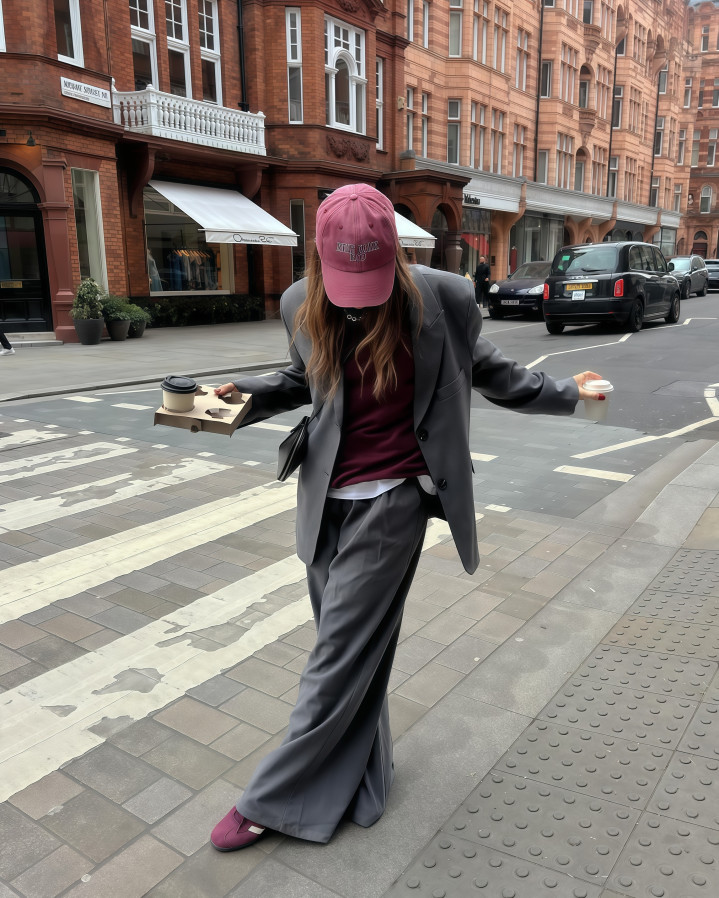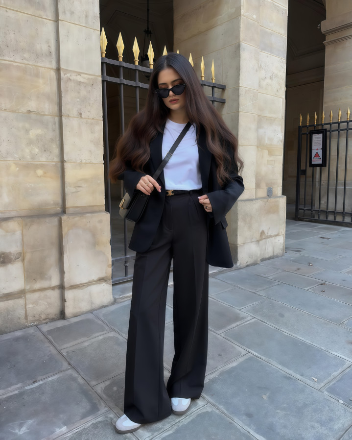 深色西装阔腿裤自己就带着职场干练的基础底细,配德训鞋不错把那股太崇敬的劲儿卸掉一半。