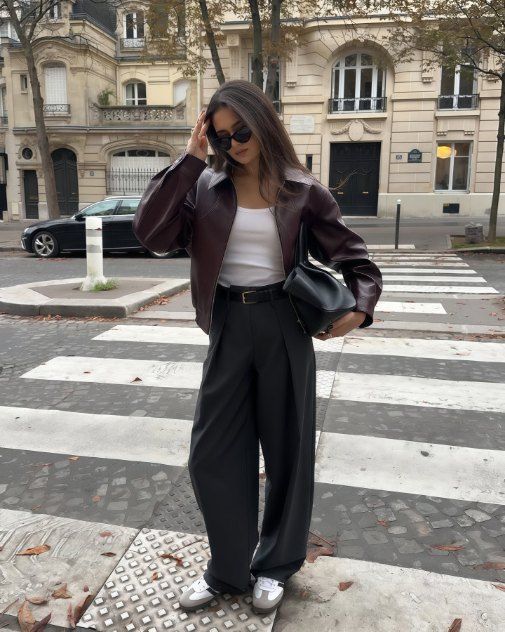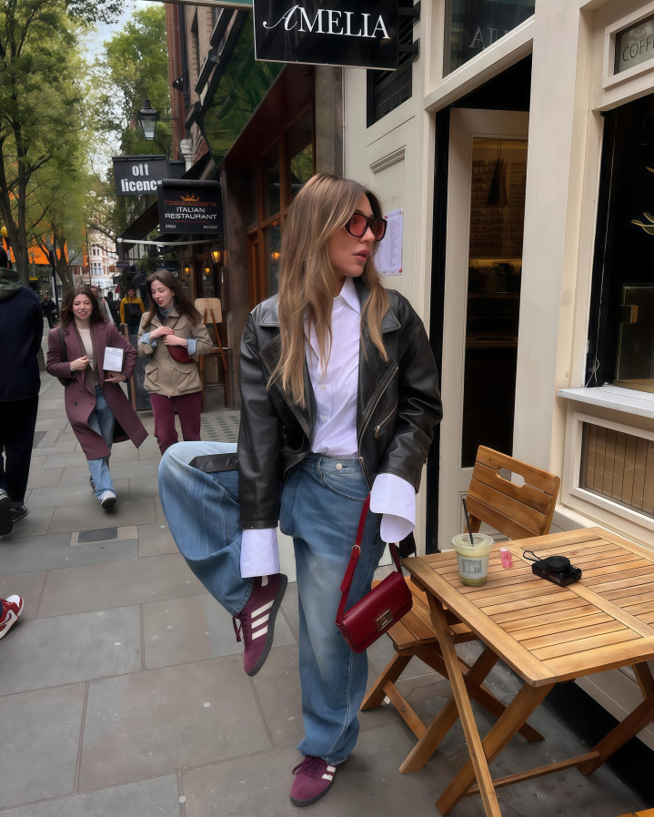 阔腿裤+德训鞋合座偏失业偏松,如果你什么配饰王人不加,穿出来就容易显得太松驰。是以,这个时辰,你就不错加一根皮质腰带,把腰线勒出来,包也别拿太软塌的帆布袋,选个有棱角的硬挺包,方包、盒子包王人行,往手上一拎或者肩上一挎,合座的质感就被撑住了。