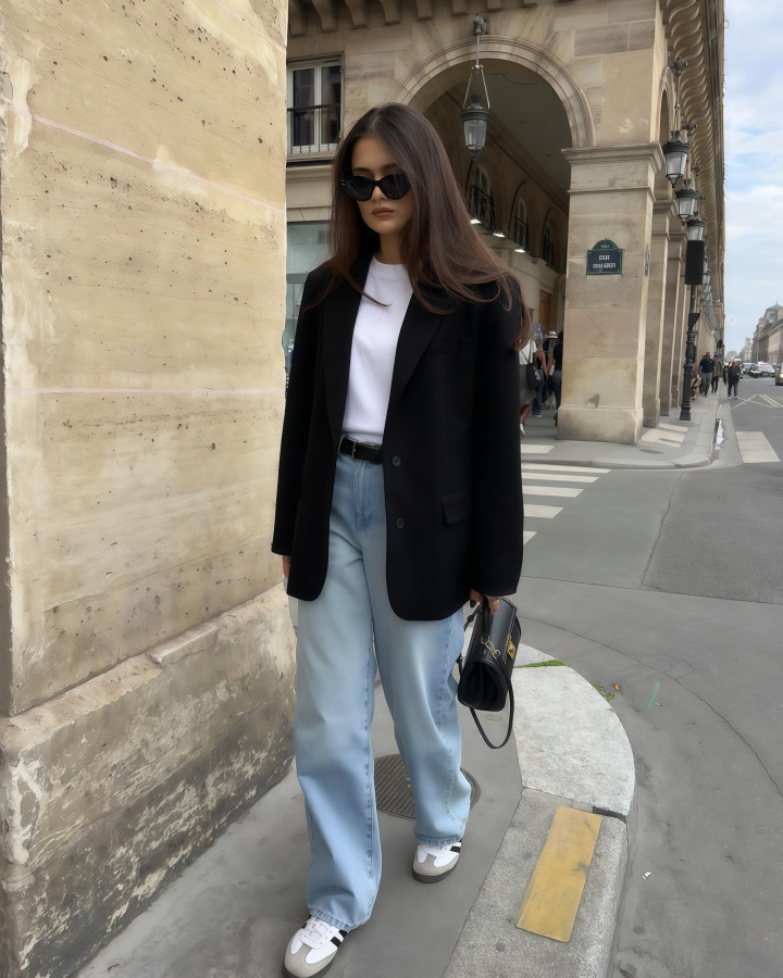 思让牛仔阔腿裤穿得更带劲,上装换成短款的玄色西装外衣,长度刚到腰线,把上半身的比例收紧了,配浅蓝牛仔阔腿裤和德训鞋,上头硬朗底下失业,立场的碰撞感很足,这套穿出去或者率会被夸。