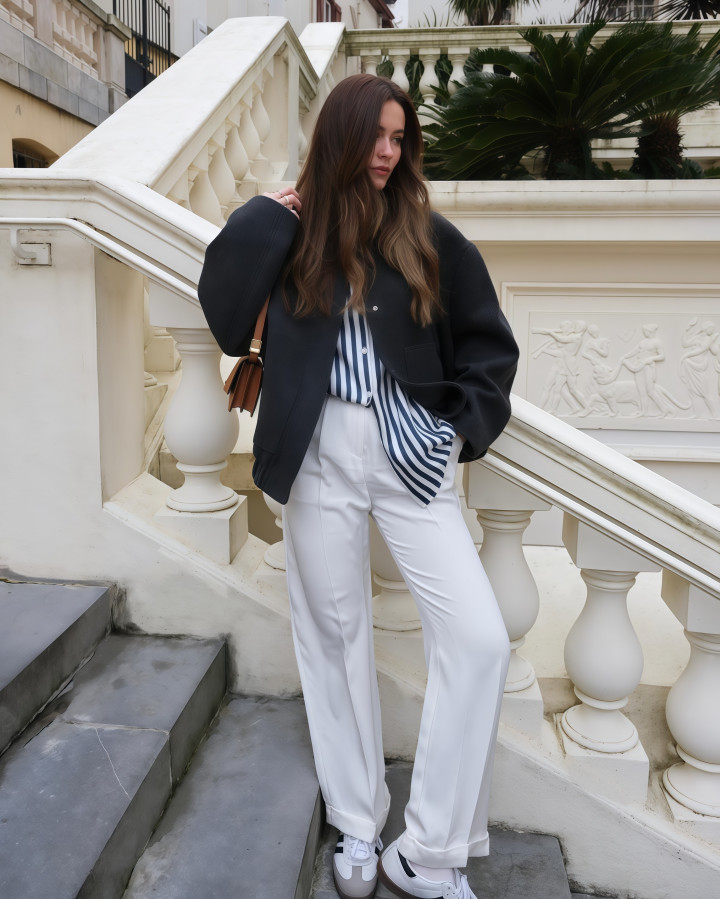 白色阔腿裤在春天是最讨喜的神采,但全身一派白容易显得没重点,这个时辰上半身加一件条纹衬衫或者条纹内搭,用线条把色块切割一下,合座随即变得有节拍,再踩双白色或者浅灰德训鞋,干净表示到极致。